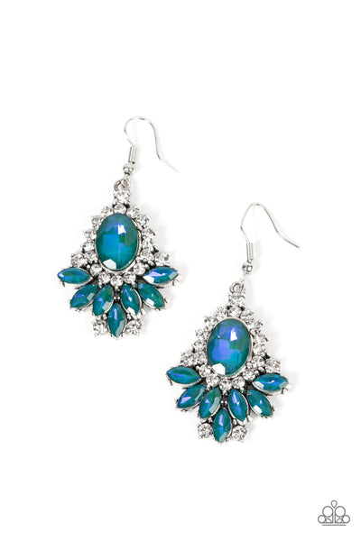Featuring a blue opalescent finish, staggered layers of marquise cut green rhinestones fan out from an oversized green gem that is bordered in a ring of glittery white rhinestones for an enchanting finish. Due to its prismatic palette, color may vary. Earring attaches to a standard fishhook fitting.