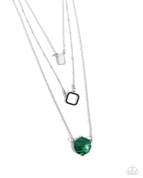 Infused with three colorful pendants, three shimmery silver chains layer across the chest. Pressed in a silver rectangular frame, a white shell swings from the uppermost chain above a jet-black rhinestone-encrusted diamond-shaped frame. A green-marbled stone hangs from the lowermost chain for a playful vibe. As the stone elements in this piece are natural, some color variation is normal.