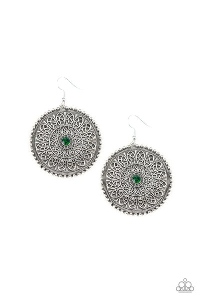 A dainty green rhinestone is pressed into the center of a round silver frame radiating with ornate petals, creating a frilly frame. Earring attaches to a standard fishhook fitting.