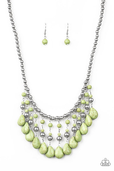 Shiny silver beads are threaded along an invisible wire below the collar. Infused with silver beaded accents, refreshing green stone beads swing from the bottom of the beaded strand, creating an earthy fringe. Features an adjustable clasp closure.