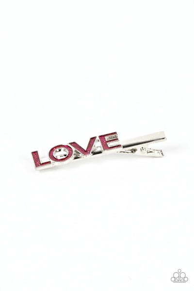 Featuring a glittery pink finish, the word, "Love," is spelled across the front of a pair of silver hair clips for a colorfully charming look. Features standard hair clips on the back.