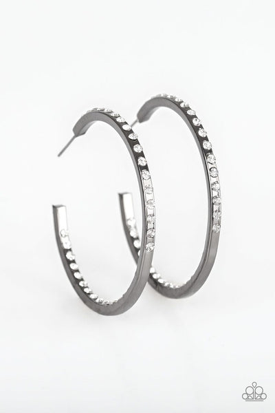 The front half and inner backside of a sleek gunmetal hoop is encrusted in glassy white rhinestones, easily catching and reflecting the light for an extra dash of shimmer. Earring attaches to a standard post fitting. Hoop measures approximately 2" in diameter.