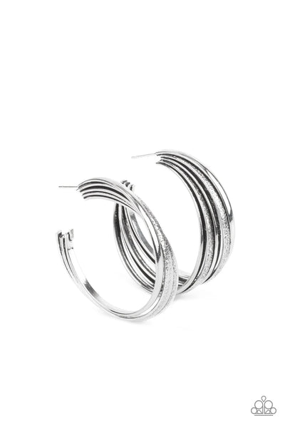 Alternating rings of textured and shiny silver fuse together creating a curvy ribbon of rustic drama as they wrap around behind the ear. Earring attaches to a standard post fitting. Hoop measures approximately 2" in diameter.