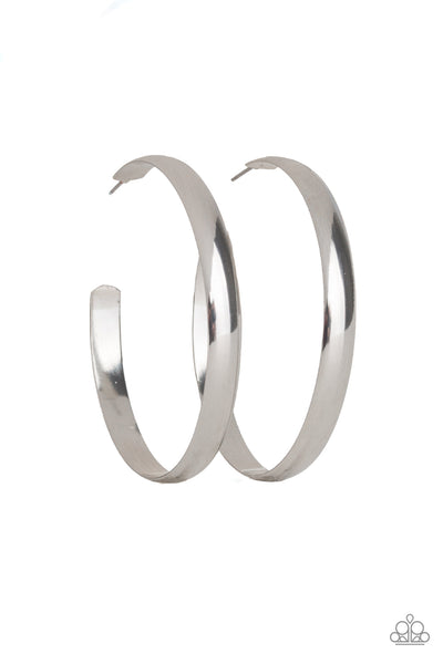 Brushed in a high-sheen shimmer, a flat silver bar curls into a classic hoop for a timeless sheen. Earring attaches to a standard post fitting. Hoop measures approximately 2 1/2" in diameter.
