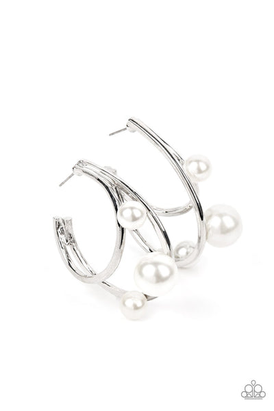 Two dainty silver bars curve into dazzling double hoops, creating asymmetrical framework. Varying sizes of classic pearls dot the edges of the classic hoops, creating the illusion of floating pearl accents. Earring attaches to a standard post fitting. Hoop measures approximately 1 1/2 in diameter.