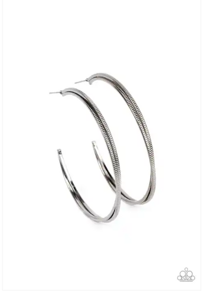 Etched in ribbed texture, two glistening gunmetal bars gently curve and stack into an oversized hoop for a classic metallic look. Earring attaches to a standard post fitting. Hoop measures approximately 2" in diameter.