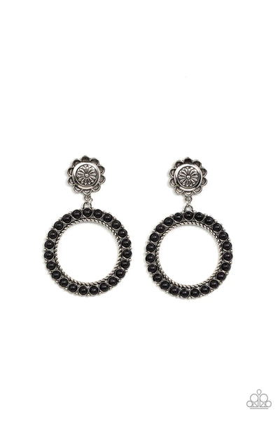 Featuring studded and twisted rope-like silver accents, a black stone dotted hoop swings from the bottom of a rustic silver flower for a whimsically floral fashion. Earring attaches to a standard post fitting.