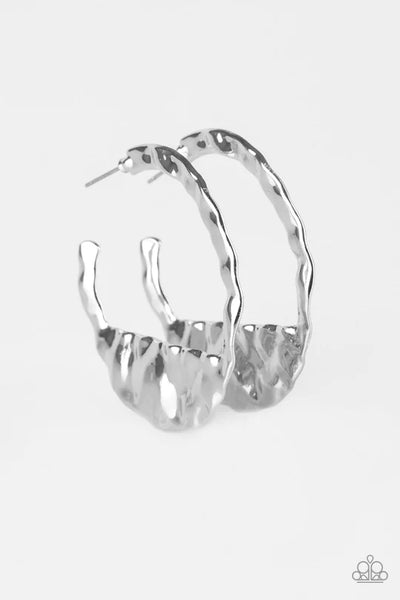 Delicately hammered in shimmery textures, an asymmetrical silver hoop curls around the ear for a fierce artisan fashion. Earring attaches to a standard post fitting. Hoop measures 2" in diameter.