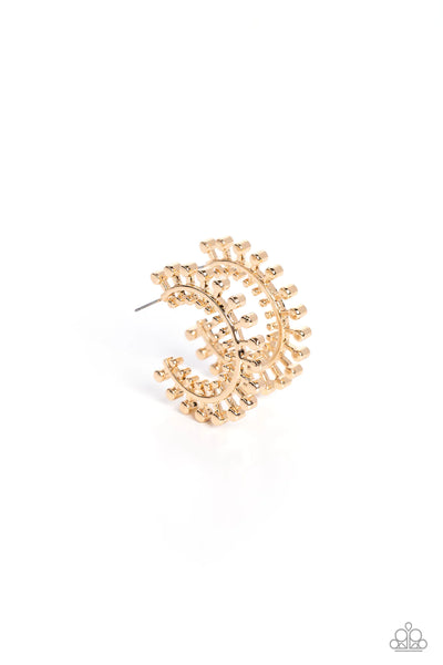 Tactile gold studs fan out along a classic gold hoop, erupting into a brilliant display of texture and sheen. Smaller studs line the inner edge of the hoop, adding additional eye-catching detail to the adventurous design. Earring attaches to a standard post fitting. Hoop measures approximately 1 1/4" in diameter.