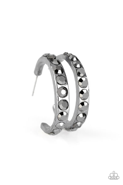 Gradually increasing in size near the center, glassy hematite rhinestones are encrusted down the spine of a dainty gunmetal hoop for a grunge-glamorous look. Earring attaches to a standard post fitting. Hoop measures approximately 1 1/4" in diameter.