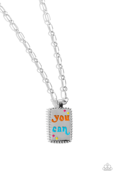 Embellished with a silver-studded border, a sleek silver rectangle pendant featuring the phrase "you can" and star accents in shades of orange, turquoise, pink, and yellow, glides along a silver paperclip chain for an inspirational display. Features an adjustable clasp closure.