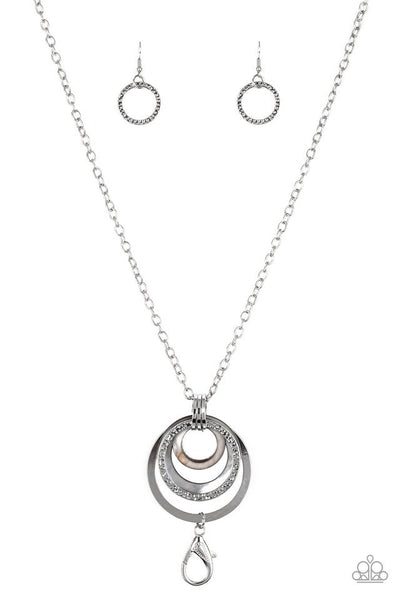 Brushed in an iridescent finish, shell-like hoops join mismatched silver hoops at the bottom of an elongated silver chain for a whimsical look. A lobster clasp hangs from the bottom of the design to allow a name badge or other item to be attached. Features an adjustable clasp closure.
