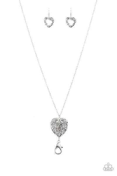 Swirling with ornate floral filigree details, an ornate heart frame swings from the bottom of a lengthened silver chain for a vintage inspired look. A lobster clasp hangs from the bottom of the design to allow a name badge or other item to be attached. Features an adjustable clasp closure.