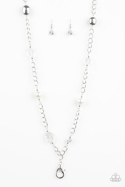 A collection of crystal-like, shiny silver, and pearly white beads trickle down a shimmery silver chain for a refined flair. A lobster clasp hangs from the bottom of the design to allow a name badge or other item to be attached. Features an adjustable clasp closure.