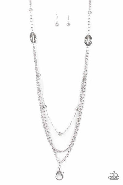 Infused with smoky crystal-like beads, a pair of smoky gems gives way to layers of mismatched silver chains for a refined look. A lobster clasp hangs from the bottom of the design to allow a name badge or other item to be attached. Features an adjustable clasp closure.