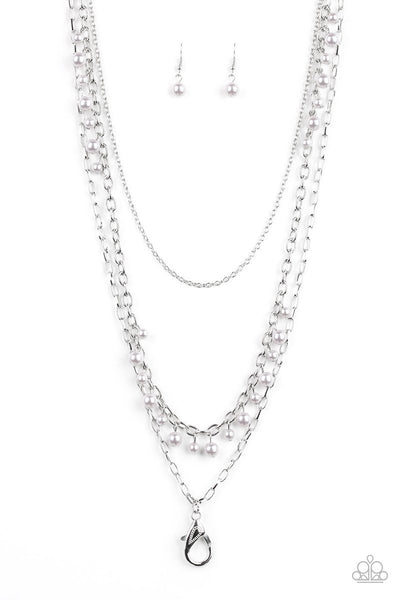Three mismatched silver chains layer down the chest. Dainty silver pearls cascade down one silver chain, creating a refined fringe. A lobster clasp hangs from the bottom of the design to allow a name badge or other item to be attached. Features an adjustable clasp closure.