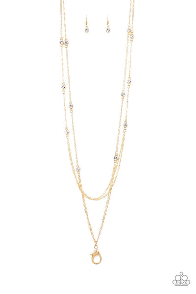 Dotted with glittery white rhinestones, two glistening gold chains give way to layers of dainty gold chain for a refined look. A lobster clasp hangs from the bottom of the design to allow a name badge or other item to be attached. Features an adjustable clasp closure.