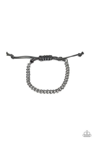 Shiny black cording knots around the ends of a gunmetal beveled curb chain that is wrapped across the top of the wrist for a versatile look. Features an adjustable sliding knot closure.