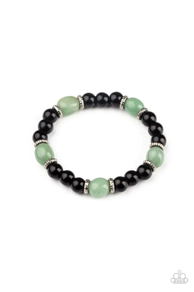 Infused with dainty silver accents, glassy black and green stone beads are threaded along a stretchy band around the wrist for a stackable seasonal look.