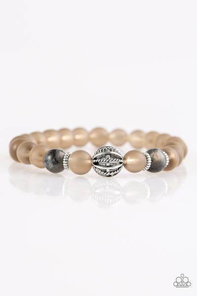Infused with silver accents, glassy brown and smooth natural stones are threaded along a stretchy elastic band for a seasonal look.