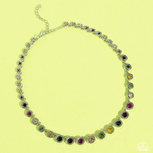 Spanning around the entirety of the neckline, a refined collection of colorful rhinestones are pressed into airy, studded, silver square frames, tilted on their sides for a three-dimensional shimmer. The frames and rhinestones gradually increase in size as they fall down the neckline, accentuating their colorful sparkle. Features an adjustable clasp closure.