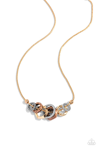 A gritty assortment of rope-like rings, hammered rings, and faceted rings in gold, silver, and copper finishes glide along a rounded gold snake chain, creating an intense industrial display below the collar. Features an adjustable clasp closure.