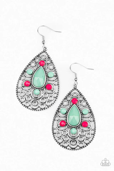A collection of faceted pink and Biscay Green beads adorns the front of a frilly silver teardrop, creating a flowery frame. Earring attaches to a standard fishhook fitting.