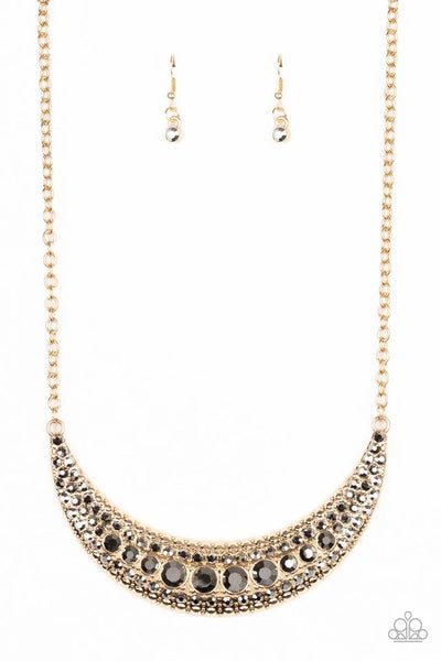 Varying in size, row after row of smoky hematite rhinestones are encrusted along the front of a studded half moon gold frame, creating a glittery statement below the collar. Features an adjustable clasp closure.