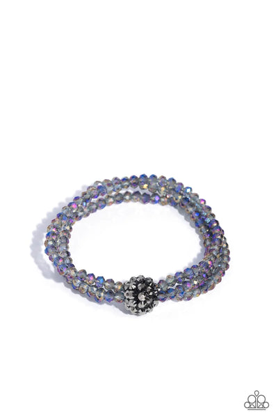 Featuring faceted finishes, oil spill beads are threaded along three stretchy bands around the wrist. Encrusted in gunmetal spiky-like details, an oversized ball twists at the center of the wrist for a fierce industrial statement.