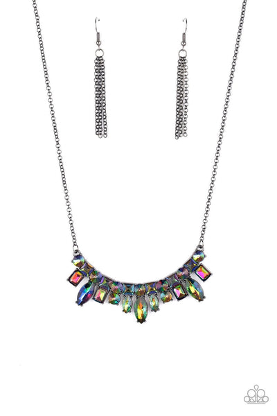 A collision of round, square, emerald, and marquise cut oil spill rhinestones coalesce into a dazzling pendant below the collar for an edgy elegance. Features an adjustable clasp closure.