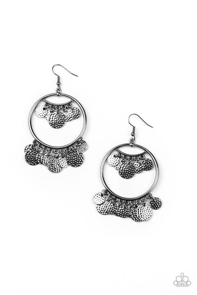 A collection of hammered gunmetal discs swing from the top and bottom of a shimmery gunmetal hoop, creating a noisy fringe. Earring attaches to a standard fishhook fitting.