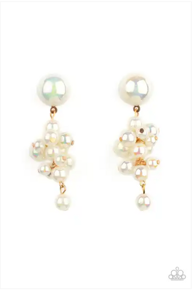 Featuring an iridescent shimmer, a bubbly collection of white pearls delicately cluster at the bottom of a matching half pearl fitting for an effervescently flirty look. Earring attaches to a standard post fitting.