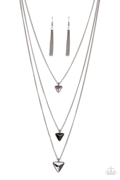 Glassy iridescent, black, and smoky triangular gems gradually increase in size as they swing from the bottoms of extended gunmetal chains, layering into an edgy shimmer across the chest. Features an adjustable clasp closure.
