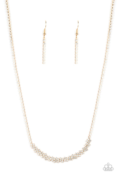 A dainty strand of glittery white rhinestones attach to a bowing pendant encrusted in blinding white rhinestones, creating a glitzy look below the collar. Features an adjustable clasp closure.