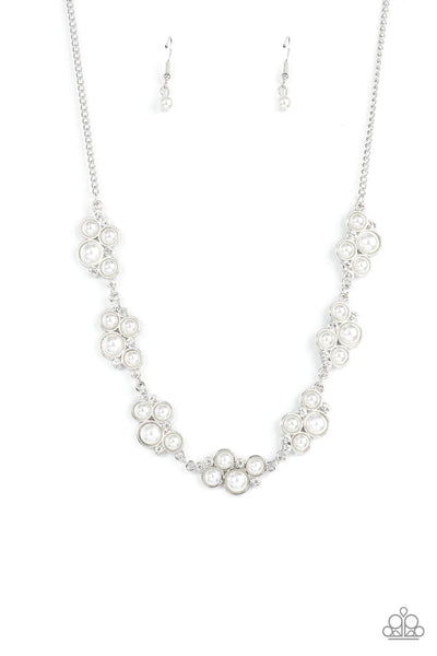 Bubbly clusters of dainty white rhinestones and white pearls delicately link below the collar, resulting in a timeless centerpiece. Features an adjustable clasp closure.