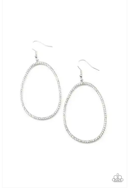 Dotted in dainty white rhinestones, an asymmetrical oval silver frame swings from the ear for a sassy look. Earring attaches to a standard fishhook fitting.