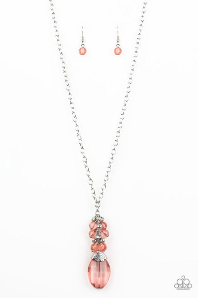 A collection of glassy coral beads, dainty silver beads, and glassy white rhinestones gives way to a dramatic crystal-like gem, creating a dramatic pendant. Features an adjustable clasp closure.