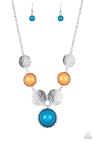 Embossed in wavy textures, shiny silver discs link with bubbly orange and Mosaic Blue beaded frames below the collar, creating a colorful statement piece. Features an adjustable clasp closure.