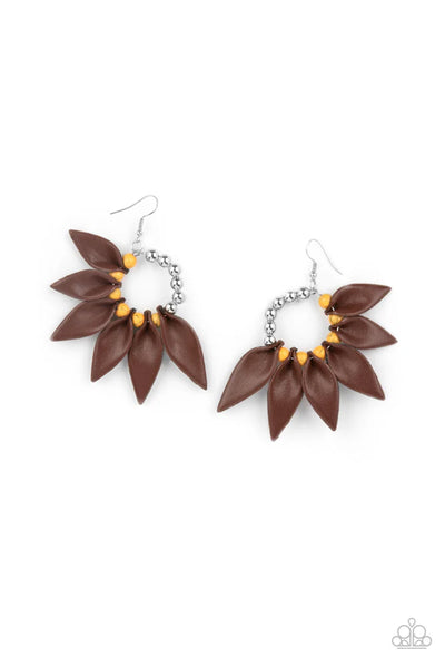 Infused with a row of shiny silver beads, brown leather petals are separated by Marigold stones along a dainty silver hoop, creating a wild fringe. Earring attaches to a standard fishhook fitting.