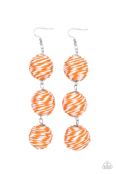 A woven collection of orange and white crepe-like strings ornately wraps around three hanging beads, reminiscent of decorative party lanterns. Earring attaches to a standard fishhook fitting.