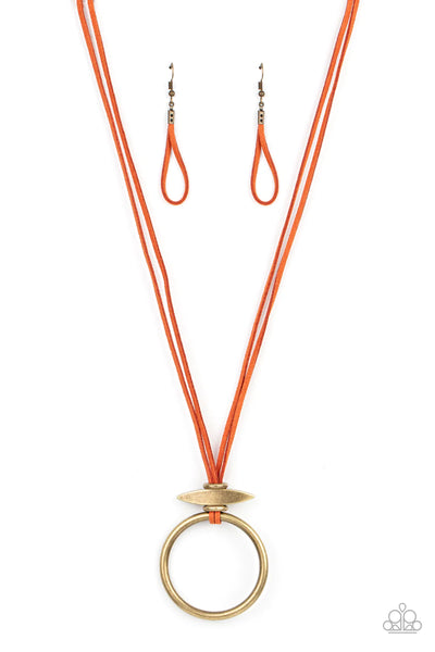 Flanked by dainty brass rings, a marquise shaped brass bead glides along lengthened strands of rustic orange suede, holding in place an oversized brass ring at the bottom for an artisan inspired fashion. Features an adjustable clasp closure.