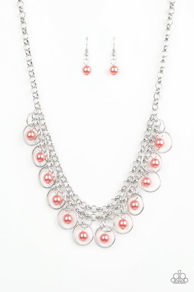 A collection of airy silver hoops and bubbly coral pearls swing from the bottom of interlocking silver chains, creating a flirtatious fringe below the collar. Features an adjustable clasp closure.