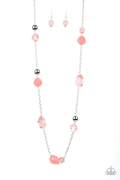 Infused with oversized silver beads, a collection of glassy and opaque coral crystal-like beads trickle along a shimmery silver chain for a whimsical look. Features an adjustable clasp closure.