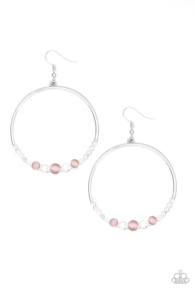 A collection of glittery white rhinestones and glowing pink cat's eye stones are encrusted along the bottom of a glistening silver hoop for a refined look. Earring attaches to a standard fishhook fitting.