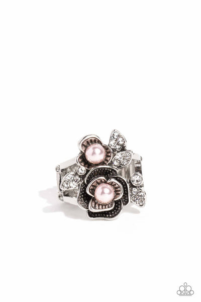 Rippling in ornate detail, folds of silver petals with pink pearl centers bloom atop the finger for a seasonal look. White rhinestone-encrusted silver leaves peek out from the airy floral display for additional sheen and glitz. Features a stretchy band for a flexible fit.