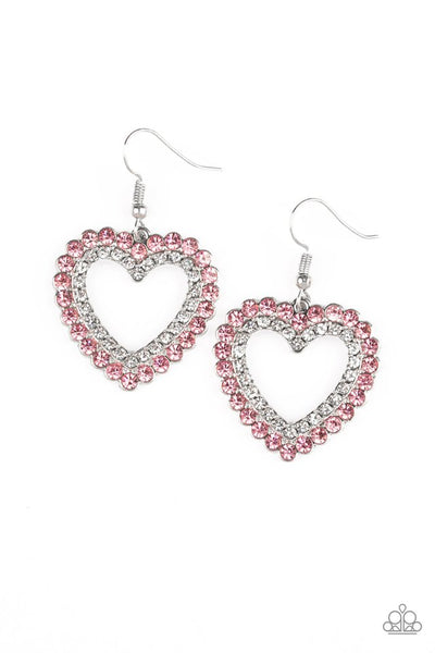 A row of glittery pink rhinestones dances along the edge of a white rhinestone encrusted heart frame for a flirtatious look. Earring attaches to a standard fishhook fitting.