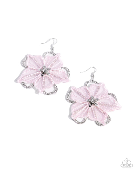 Delicately perched atop an airy, silver, white rhinestone-encrusted floral frame, a light pink lace appliqué flower blooms from the ear. Smaller, dainty silver petals bloom from a white gem center atop the light pink lace appliqué, creating the ultimate three-dimensional, whimsically elegant centerpiece. Earring attaches to a standard fishhook fitting.