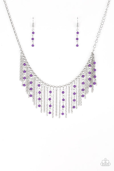 Infused with purple beaded tassels, shimmery silver chains stream below the collar, creating a colorful fringe. Features an adjustable clasp closure.