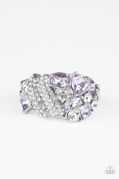 Varying in shape and size, a refined collision of purple and white rhinestones clash into a dazzling clustered centerpiece atop the finger. Features a dainty stretchy band for a flexible fit.