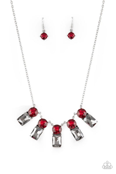 A sparkly row of oversized red gems regally sit atop emerald cut smoky rhinestone bases as they delicately link along a dainty silver chain below the collar, resulting in a royal glamorous centerpiece. Features an adjustable clasp closure.